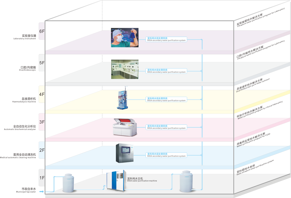 無(wú)論清洗消毒機(jī)、血液透析機(jī)、內(nèi)窺鏡、口腔設(shè)備、全自動(dòng)生化儀、實(shí)驗(yàn)分析等用水儀器是在一座大樓的同層或不同樓層,還是在不同的大樓,宜科均可配合最合理管路路徑與之實(shí)現(xiàn)無(wú)縫連接,通過(guò)管路同主供水系統(tǒng)相通,形成自動(dòng)循環(huán)完成水的初級(jí)處理和儲(chǔ)備,再通過(guò)各后處理系統(tǒng)完成水的分質(zhì)分級(jí)處理,滿足不同用水設(shè)備對(duì)水質(zhì)需求的不同。